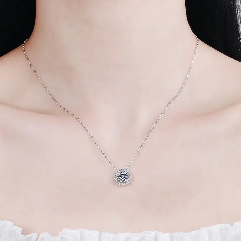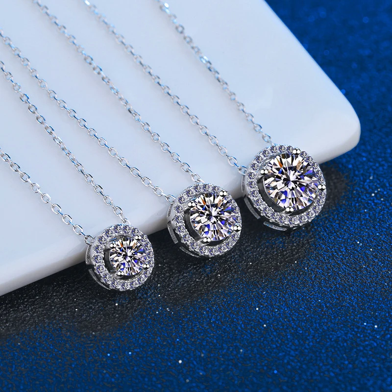 Certified 0.5-2CT VVS Brilliant Moissanite Diamond Halo Pendent Necklaces