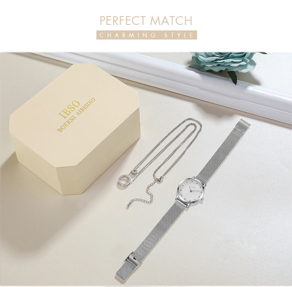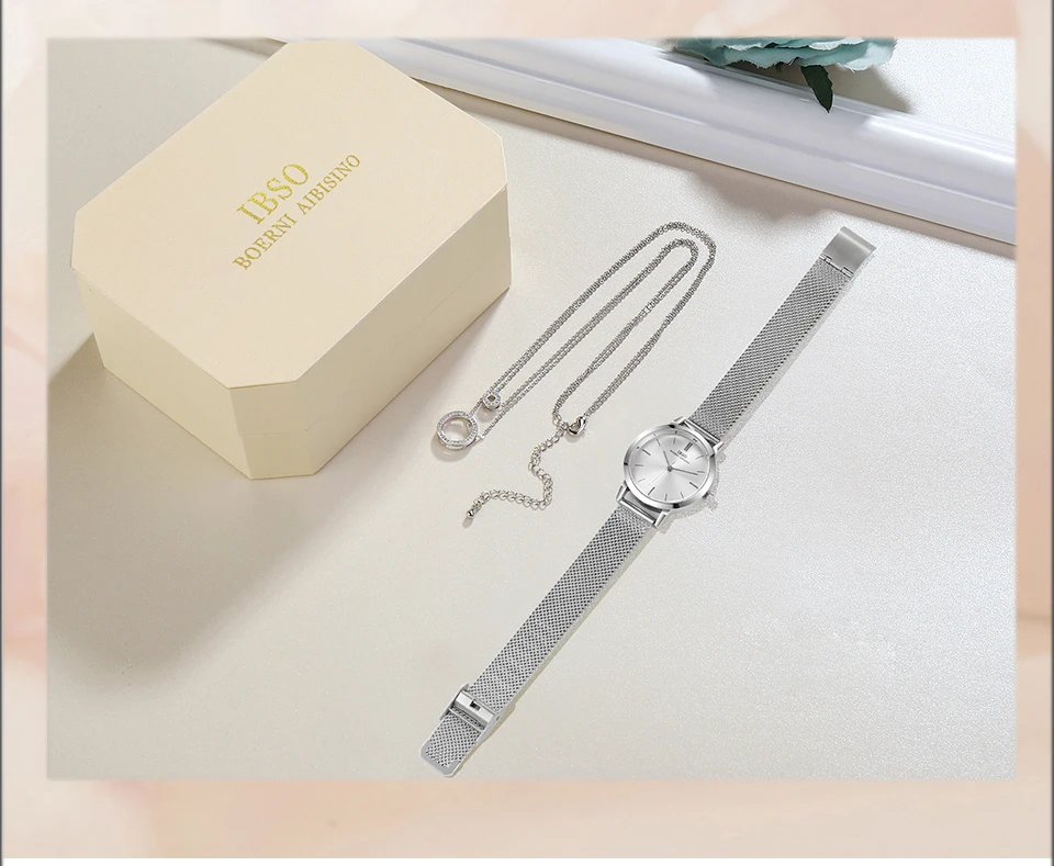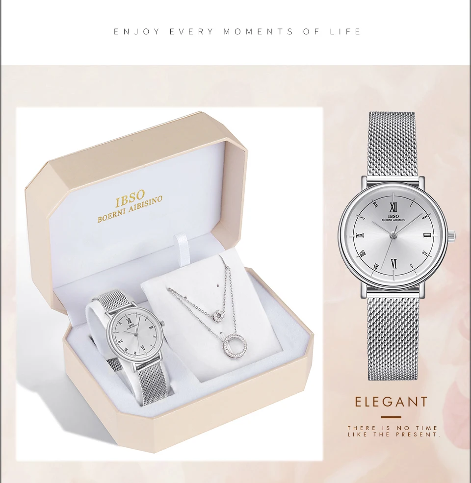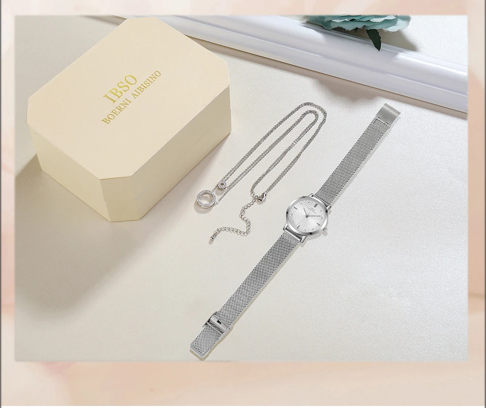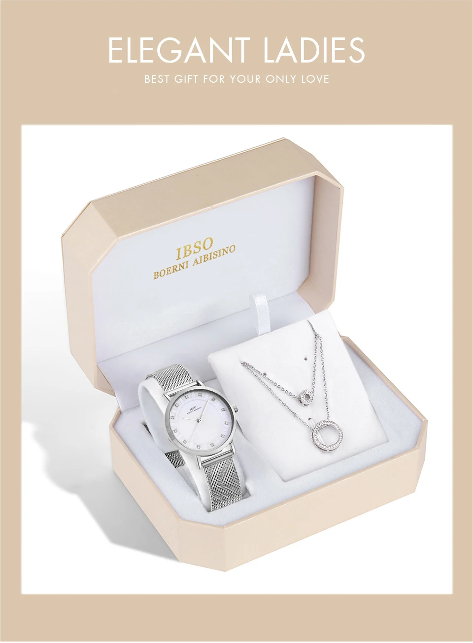 Quartz Wrist watch Necklace Earring Combination Set Women Metal Strap